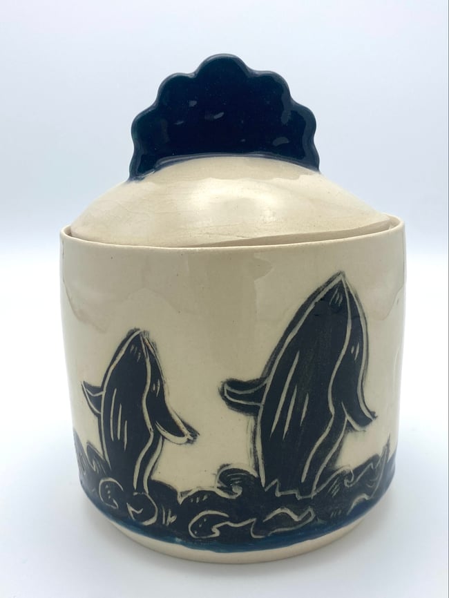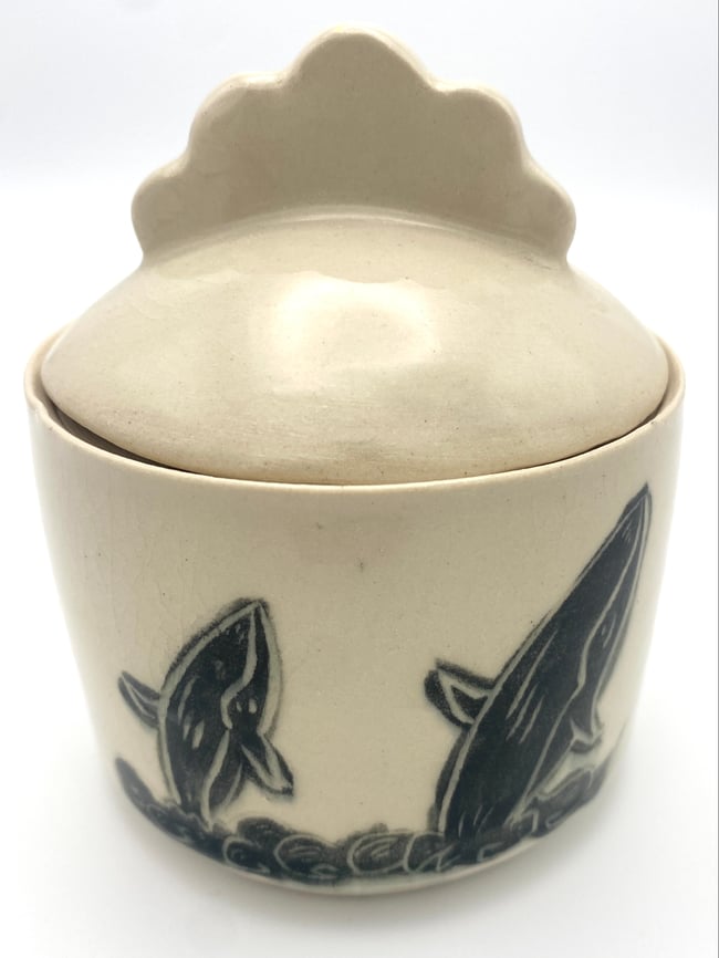 Wheel thrown stoneware jar with Sgraffito whale design and blue interior glaze.