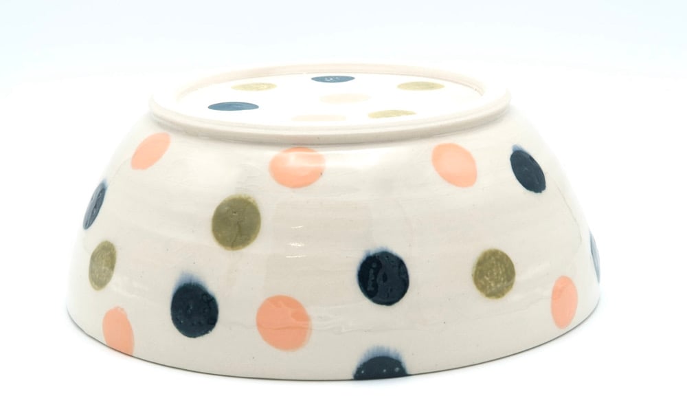 Wheel thrown stoneware serving bowl with underglaze polka dots!